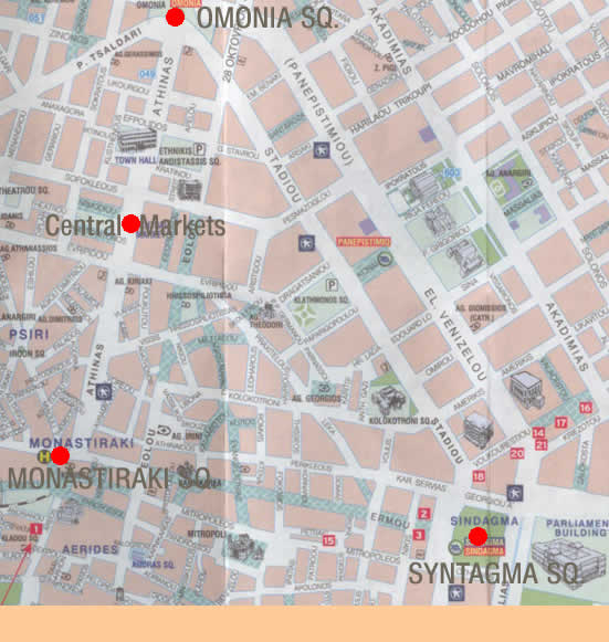 Harry's Athens Greece Guide The Central Markets are just a short walk down Athinas street from Monastiraki Sq., on the way to Omonia Sq. or vice versa. In the middle between the two squares. Its 5 minutes from Hadrians Library and Monastiraki Sq.